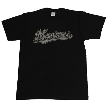 表裏、両面とも大きくロゴがメタリックカラーでプリントされたTシャツです。表はマリーンズロゴ、裏には2017年のチームスローガンが大きくレイアウトされています。