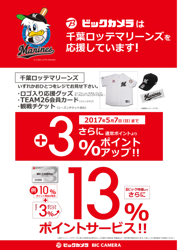 ビックカメラ柏店と船橋駅店にてTEAM26会員証等をご提示でいただくと、ビックポイントが通常ポイントより、さらに3%アップの応援キャンペーンを実施します。