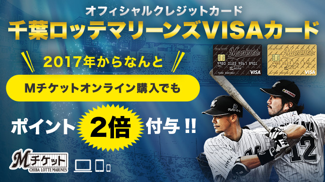 マリーンズファンなら必携のオフィシャルクレジットカード、「千葉ロッテマリーンズVISAカード」がよりパワーアップの上、満を持して受付を再開しました。なんと、今年から新たに、Mチケットオンラインでのチケット購入にもポイント2倍を付与します。もちろん、昨年同様ZOZOマリンスタジアムでの利用に対するポイント2倍付与はそのまままに。