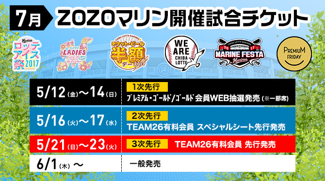 7月ホームZOZOマリン開催試合のイベント情報!! 今回のチケット発売対象試合は7月4日(火)から夏休み最初の週末カード・7月30日(日)までです。特に7月17日(月・祝)「スーパーレディースデー2017」レディースTシャツ配布、7月18日(火)「チケット・ビール半額デー」、7月30日(日)「マリンフェスタ2017」マリンフェスタユニフォーム配布など、人気イベント試合のチケットはお早めに!!