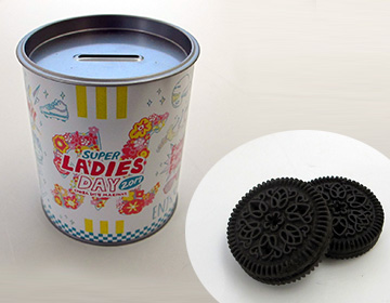 スーパーレディースデーのロゴをあしらったカラフルな貯金缶はココアサンドビスケット入りです。