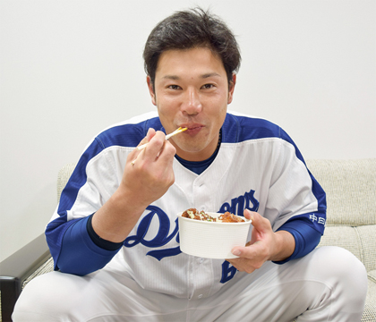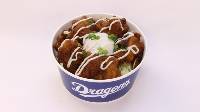 中日ドラゴンズ 堂上選手プロデュースメニュー “堂上丼”から揚げ丼温玉トッピング~にんにくソース&マヨネーズ