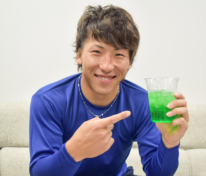 テキーラスキの亀澤選手は、テーマカラーの緑にかけてファンタメロンで割ってみました。 「まぁ、間違いない組み合わせだよね」と言いつつ試飲してみると、「やばい、これ美味い!」予想以上の美味しさにびっくり!飲みすぎ注意のカクテルです。