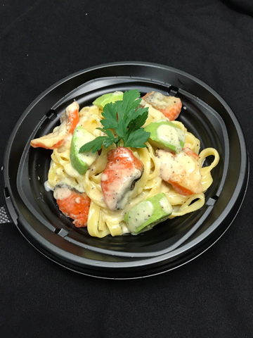 フィットチーネと乳酸菌飲料入りホワイトソースがベースのパスタを作りました。 アボガドと鮭が入った女性に人気のメニューです。