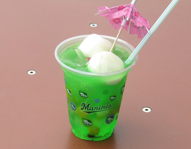雪見大福(Y)をソーダ(S)に入れたポンチです。 緑色のソーダの中にフルーツや寒天などを入れて具沢山なポンチに仕上げました。 また名物の傘をイメージしたトッピングもポイントです!!
