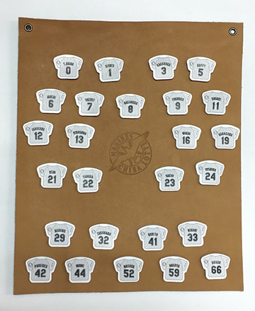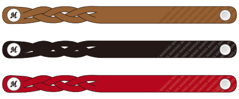 好きな文字や数字を打刻し、マリーンズロゴやマーくんイラストが入った、自分だけのマリーンズオリジナル革製品(ブレスレット、キーホルダー)をその場で制作するワークショップです。牛ヌメ革を使用しているので本革特有の経年変化もあわせてお楽しみいただけます。
