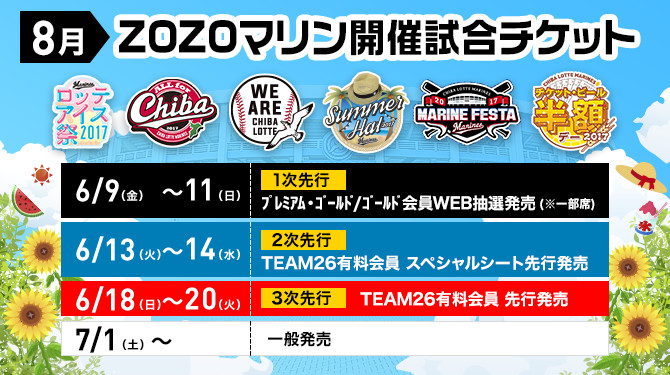 8月ホームZOZOマリン開催試合のイベント情報!! 今回のチケット発売対象試合は8月1日(火)から8月31日(木)まで。特に8月11日(金・祝)ピンストライプユニフォーム配布、8月12日(土)マリーンズ・サマーハット配布、8月13日(日)マリンフェスタ&花火1,000発打ち上げ、8月31日(木)チケット・ビール半額デーなど、人気イベント試合のチケットはお早めに!!