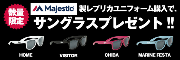 マリーンズストアでは、マジェスティック社製レプリカユニフォームを購入いただいた方に、ユニフォームカラーに合わせた特製サングラス(非売品)をプレゼントするユニフォーム購入キャンペーンを6月30日(金)より開催します。ユニフォームと同じ全4色展開の特製サングラスは、マジェスティック社とマリーンズのロゴがプリントされ、球場での応援にも、普段使い(カジュアル)にも重宝するデザインです。