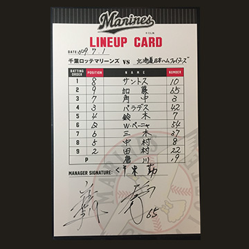 公式戦ホームゲームに先発したマリーンズのスターティングラインナップが記載されたカードに、伊東監督、先発投手の直筆サインを入れてお届けします。マリーンズが勝利した試合には、ヒーローインタビューに登場した選手のサインも加わるプレミアムな1枚です。
