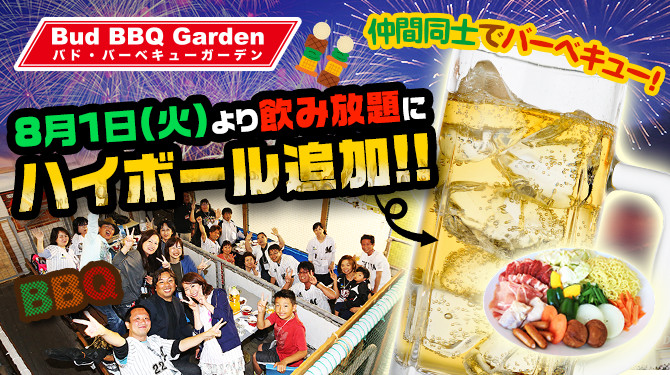 いよいよ夏本番!!バド・バーベキューガーデンでは、8月1日(火)から2017年シーズン終了まで、飲み放題ラインナップに「ハイボール」を追加します!! 会社での暑気払いや、グループ・サークルでの懇親会に是非バド・バーベキューガーデンをご利用ください!!