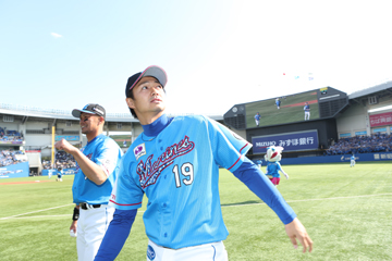 監督・コーチ、選手全員がスタンドにサインボールの投げ入れを行います