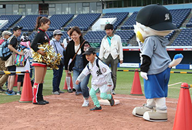 選手が駆け巡るタイヤモンドでベースランニングに挑戦!!ベースランニングに参加されない方も、外野エリアでグラウンドウォークをお楽しみください。