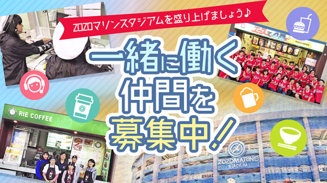 ZOZOマリンスタジアムで一緒に働いてみませんか? グッズショップ・チケット販売・飲食販売・ドリンク立売・ファンクラブブースなど、ZOZOマリンスタジアムにはやりがいのあるお仕事がいっぱい!! 一緒にZOZOマリンスタジアムで千葉ロッテマリーンズを盛り上げましょう!! 皆様からのたくさんのご応募をお待ちしております!!