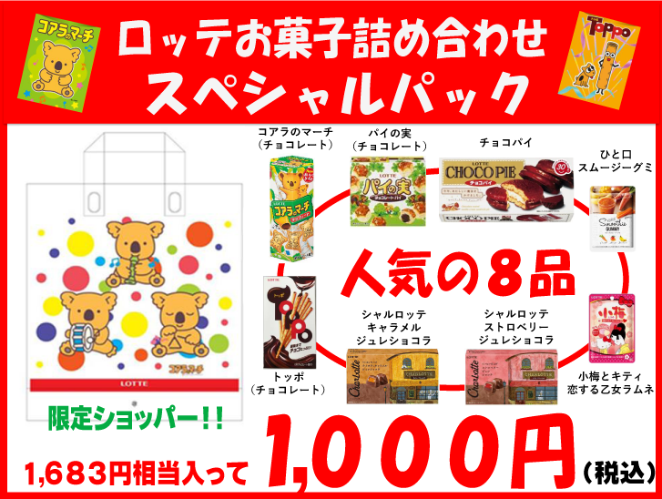 3月30日(金)にお得な「ロッテのお菓子詰合せ」を販売いたします!! 1,683円相当分のお菓子が入ったパックが1,000円と大変お得なセットとなっております!! 可愛いコアラのマーチの手提げ袋もポイントです。 販売場所では大きなコアラのマーチ君のぬいぐるみが皆様をお待ちしております!!