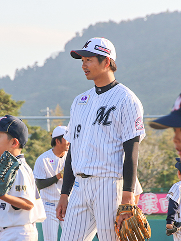 その後の技術練習前には、選手が子どもたちに口頭で概要説明。キャッチボールは関谷投手、ゴロ捕球は三木選手、フライ捕球は荻野貴選手が心掛けやコツを話し、打撃は加藤選手が手本を見せる一幕もありました。選手たちが個性を発揮して指導にあたり、これまでとはひと味違った野球教室。大盛況のうちに幕を閉じました。