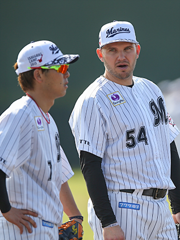 野手では、シートノックの三塁で、レアード選手が鈴木選手と安田選手とプレー。同ポジションでノックを受けるレアード選手を明るく鼓舞しながら、内野全体を盛り上げ続けたのは鈴木選手でした。新加入選手がスムーズにチームの輪に入れるための心遣いはしっかり伝わっていて、練習合流を振り返ったレアード選手は「大地が優しく迎えてくれて感謝しています。マリーンズでは新人なのでありがたい」と話していました。