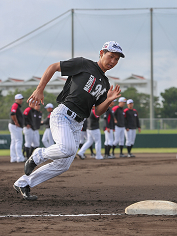 メイングラウンドではウォーミングアップ後にベースランニング。三塁コーチャーを務めた根元コーチは、ひとりひとりにタイミングの修正点などについて声をかけます。