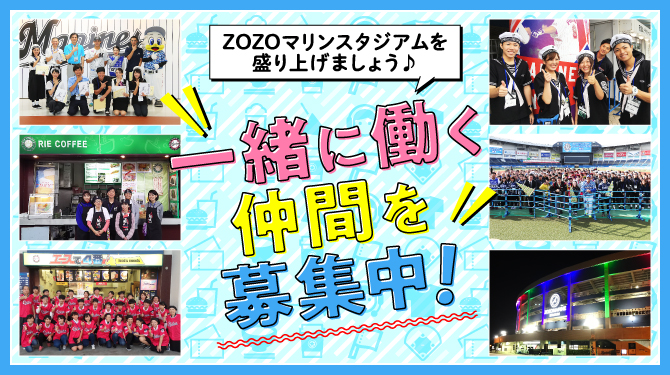 ZOZOマリンスタジアムで一緒に働いてみませんか? グッズショップ・チケット販売・飲食販売・ドリンク立売・ファンクラブブースなど、ZOZOマリンスタジアムにはやりがいのあるお仕事がいっぱい!! 一緒にZOZOマリンスタジアムで千葉ロッテマリーンズを盛り上げましょう!! 皆様からのたくさんのご応募をお待ちしております!!