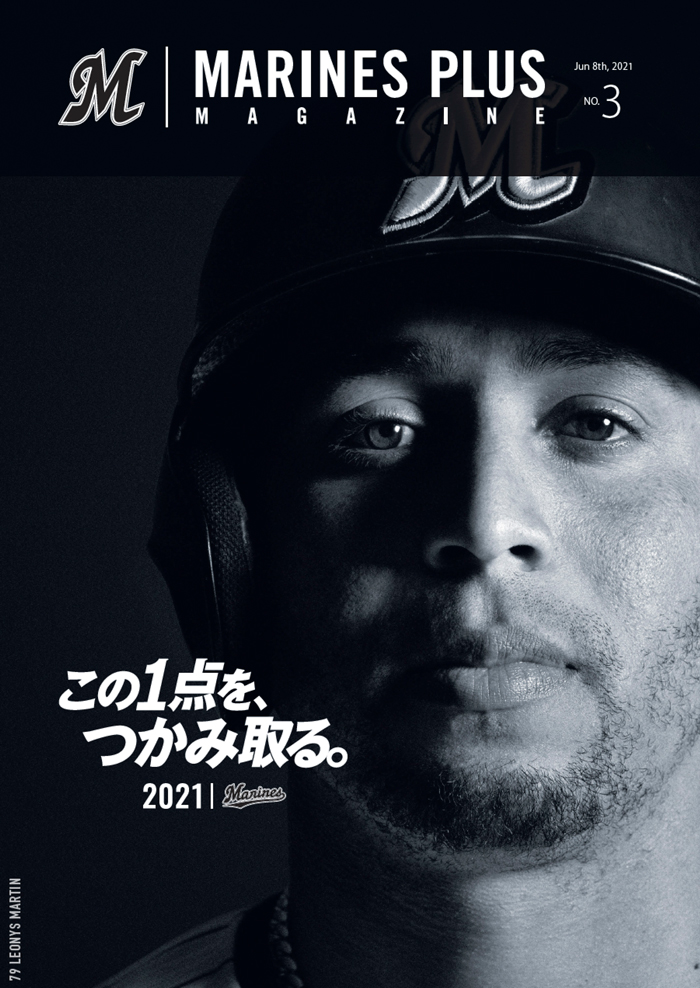 今回の表紙を飾るのはマーティン選手。オフィシャルカメラマンが厳選した16ページにわたる写真特集には、ZOZOマリンスタジアムはもちろん、ロッテ浦和球場の模様も掲載しています。