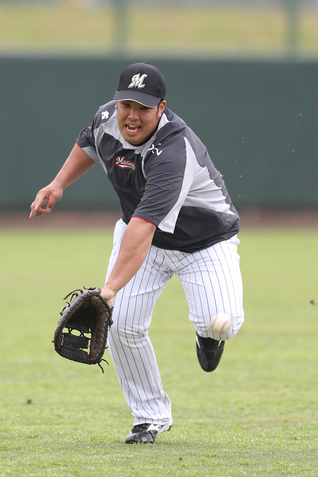 午前中で一旦雨が上がると、野手はメイングラウンドに移動してアメリカンノックを実施。年齢別にノルマが課せられ、32歳以上の選手は5本、25歳~31歳は8本、24歳以下は10本というものにそれぞれ挑みます。ファインプレーを度々見せた大嶺翔選手には他の選手からも賞賛の声があがり、軽快な動きを見せた選手たちは次々とクリアしていきます。そして、最後まで残ったのは江村選手とルーキー・井上選手。くたくたになりながら、まずは井上選手がノルマを達成すると、江村選手はコーチらに渇を入れられながらラストを締め括りました。