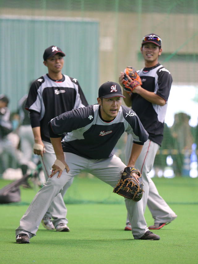 その緊迫した空気が如実に表れたのは、投手陣が熱投を展開するブルペンでした。隣接している一軍と二軍のブルペンを同時に使い、成瀬投手・涌井投手・唐川投手・益田投手・西野投手らが投球を披露すると、その球を里崎選手・川本選手・吉田選手・江村選手・田村選手らが横並びで受けます。投手・捕手ともに自分の両隣にいるライバルの気迫を感じながら、ひたすら大きなかけ声とミットに速球が収まる音が響くブルペン。打席には井口選手やブラゼル選手が立つなど、選手たちは次クールの紅白戦を前に実戦モードに入っています。