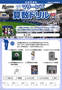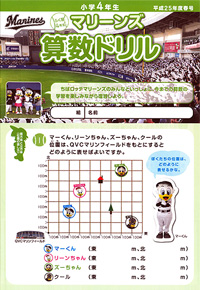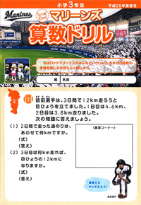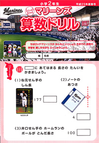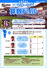 「マリーンズ算数ドリル」はNPO法人「ちば算数・数学を楽しむ会」の製作協力のもと、千葉ロッテマリーンズが制作をしたもので問題にマリーンズの選手の名前が登場したり、野球に関する出題があったり、楽しみながら勉強できる工夫が満載の内容となっております。