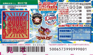 "宝くじ"とパシフィック・リーグ全6球団(北海道日本ハムファイターズ、東北楽天ゴールデンイーグルス、埼玉西武ライオンズ、千葉ロッテマリーンズ、オリックス・バファローズ、福岡ソフトバンクホークス)は、地域に根ざしながら社会へ夢をご提供する者同士バッテリーを組み、「スクラッチ」、「ロト7」の2商品についてコラボレーションすることとなりました。