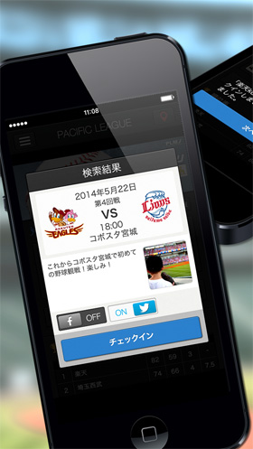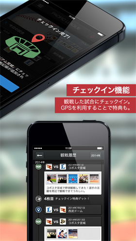 | 観戦チェックイン | GPS検索や試合情報から観戦に訪れた試合にチェックイン。 球場でチェックインした場合、選手グラフィティ(選手の写真)等の特典を入手可。 |