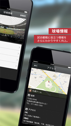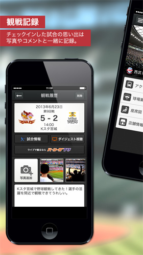 | 観戦記録 | 観戦した試合の記録を写真やメッセージと共に、その内容をTwitterやFacebookに投稿可能。思い出と試合情報を連携して記録。