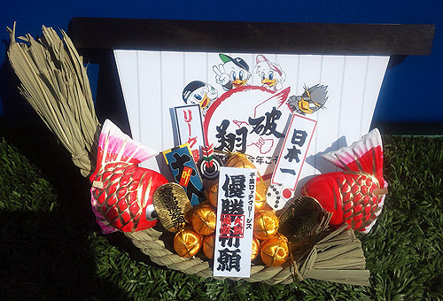 「頂点へ、今年こそ。」 縁起もの「鯛」「小判」を積んだ優勝「たいこばん」の宝船をオフィスに床の間に。