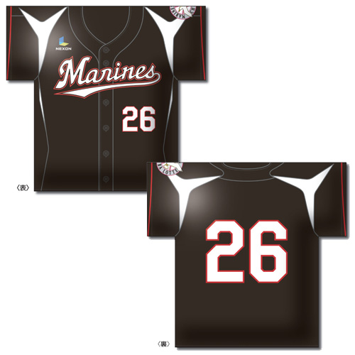赤のラインが新鮮な新ビジターユニフォーム。品薄の状態が続いておりお客様にご迷惑をおかけしておりますが、ブラックブラックナイト開催日には計1000着をマリーンズストアで発売。この機会に是非手に入れてください!!