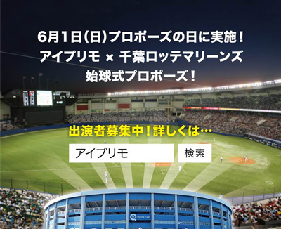ブライダルジュエリー専門店「アイプリモ」と「千葉ロッテマリーンズ」が"プロポーズの日"である6月1日(日)に彼女との一生の思い出となるプロポーズを特別な日とするお手伝いをさせていただきます。また、始球式の際は選手も協力させていただきます。