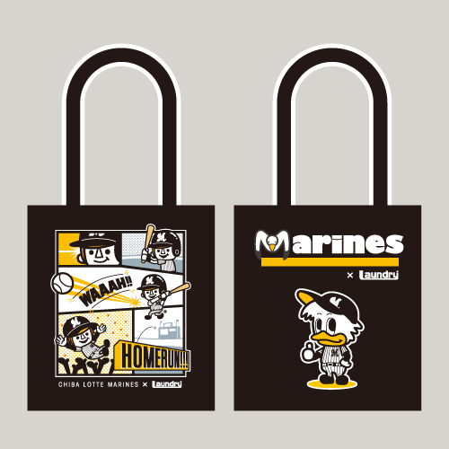 2014開幕記念として好評いただいた「マリーンズ×LAUNDRYコラボTシャツ」のデザインがバッグになりました!!野球観戦はもちろん、デイリーにもお使いいただけるポップなトートバッグです。