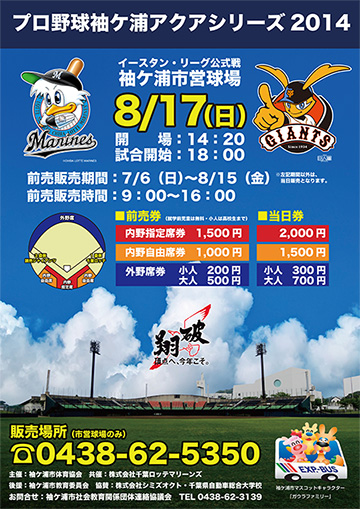 8月16日(土)と8月17日(日)のイースタン・リーグ公式戦は千葉県内の球場で開催されます。 8月16日(土)の試合は「成田市制施行60周年記念大会 第7回成田スカイシリーズ」としてナスパ・スタジアムで、8月17日(日)の試合は「プロ野球袖ケ浦アクアシリーズ2014」として袖ケ浦市営球場で開催されます。