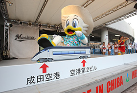 | 内容 | スカイライナーに模した台車に子供が乗って、後ろからお父さんお母さんが押して走らせます。成田空港にピッタリ届いた親子には素敵な賞品をプレゼントいたします。 |