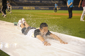雨天中止時などに選手がシート上で見せるヘッドスライディング…グラウンドで同じ体験をしてみませんか?