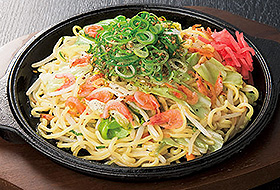 静岡県蒲原町ご当地グルメです。太目麺に静岡名物桜えびが入りまろやかに焼きあげた焼きそばです。