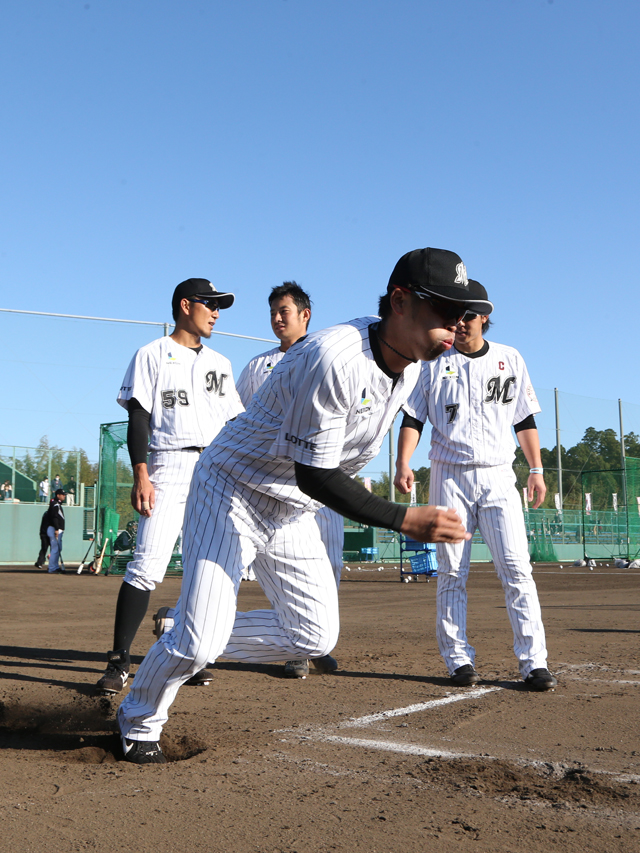 鴨川秋季キャンプは第3クールに突入!青空が広がるなか、たくさんのマリーンズファンに見守られて練習が始まりました。サブグラウンドの隣にあるサッカー場では「マリーンズ ベースボールフェスタin鴨川」を開催。駆けつけた多くの方が野球を楽しみ、無料配布した秋刀魚500匹が約1時間半でなくなるなど、各種イベントは大盛況となりました。