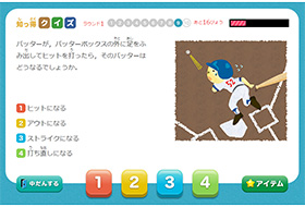 パソコンやタブレットを使って算数や国語、英語など学校の単元に沿った問題をクイズ形式で楽しく学べます。パ・リーグ6球団に関する出題もあるので、お子さまは楽しみながらクイズに取り組むことで学習意欲もアップします。