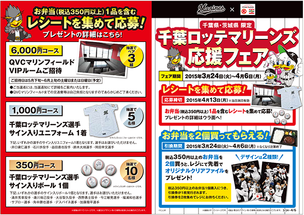 3月24日(火)~4月6日(月)まで千葉県・茨城県のサンクスにて「千葉ロッテマリーンズ応援フェア」を実施中です。 期間中、お弁当(税込350円以上)1品を含むレシートを集めて応募すると、「QVCマリンフィールド VIPルームご招待」や「選手のサイン入りユニフォーム」などがもらえるキャンペーンです。 また、期間中お弁当(税込350円以上)を2個買うと、レジにて先着で「オリジナルクリアファイル」をプレゼント(なくなり次第終了)!
