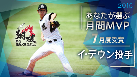 8月1日~10日まで公式スマートフォン・携帯サイトで行われた「あなたが選ぶ7月の月間MVPはどの選手?」投票ですが、今回は309票でイ・デウン投手が1位に輝きました!!