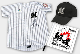 | 抽選で | ![]() ピクニックBOX ![]() 選手サインセット(ユニフォーム・キャップ・フラッグ) ![]() マリーンズ×日本一 コラボタオル |