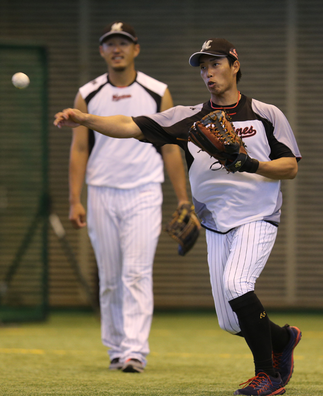 練習の最後には、今回のキャンプ初となる“ボール回し”を野手全員で行います。時計回り、反時計回りでそれぞれ25周。誰かがミスをしたら連帯責任で罰走が課せられるというルールのもと、1度だけ落球はあったものの丁寧なプレーが展開されていました。