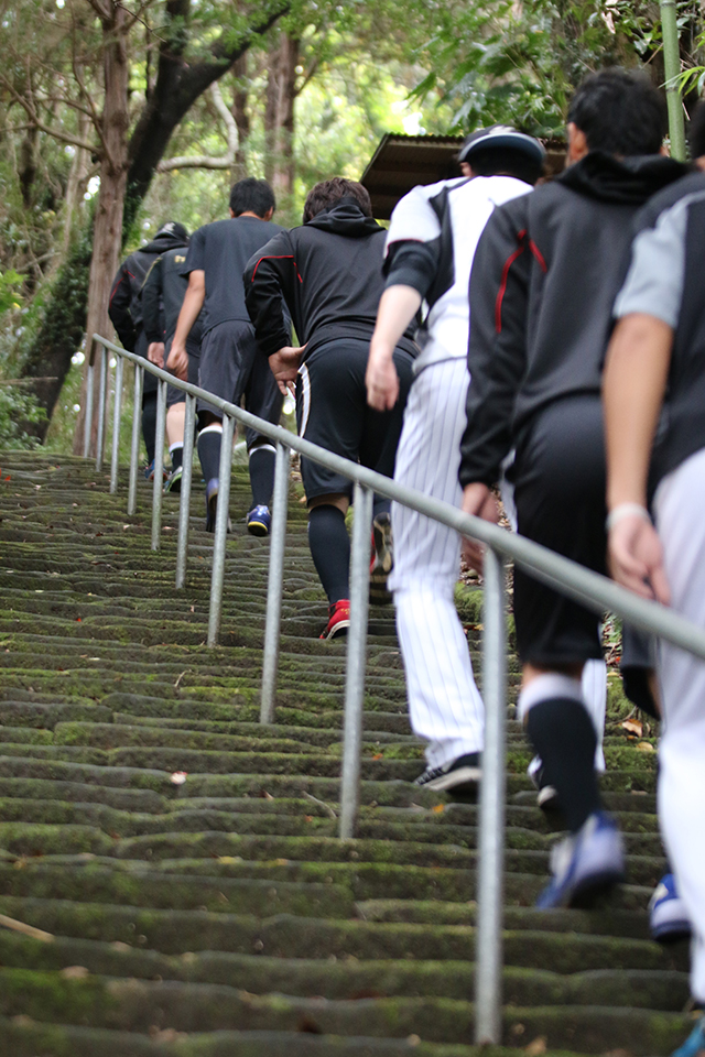 午後には投手全員で近くの神社へ移動。338段の階段を往復したトレーニングの模様は、後半のリポートでお届けします!