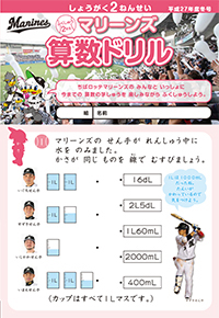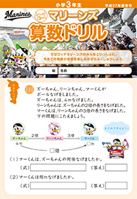 「マリーンズ算数ドリル」は、NPO法人「ちば算数・数学を楽しむ会」の製作協力のもと、千葉ロッテマリーンズが製作をしたもので問題にマリーンズの選手が登場したり、野球に関する出題があり、楽しみながら勉強ができる内容が満載となっています。