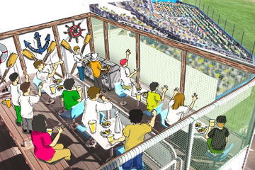 1塁側内野席のライトポールに近い上段エリアにあるスポーツカフェ&バーシート「バルM」をイタリアンバール風に内容一新。リラックスできる屋根付オープンデッキシートで、ドリンク&フードを楽しみながら応援できます。
