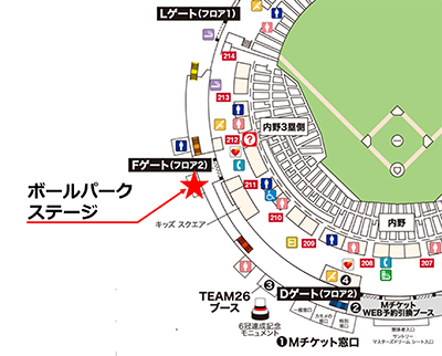2015年まで球場正面で運営してきたボールパークステージですが、2016年からはFゲート下にてイベントを行います。 このステージ移設に伴い、より多くの来場者にイベントを楽しんでいただくことを目的に、観覧ルール・撮影ルール・撮影エリアの変更を行います。 来場者の皆さんが楽しめるイベント作りへのご理解ご協力をよろしくお願いいたします。