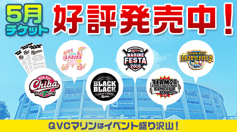5月開催分のチケットは3月20日(日)にTEAM26有料会員限定先行販売、そして4月1日(金)からは一般販売が始まります!! 5月開催は、「ALL for CHIBA」では新CHIBAユニフォームの配布があるほか、正式に発表したばかりの「BLACK BLACK CLASSIC」では初代ブラックユニフォームの配布、「スーパーレディースデー2016」では女性来場者全員へのTシャツ配布と、大型来場特典イベントが盛りだくさん。人気試合はお早めにお求めください!!