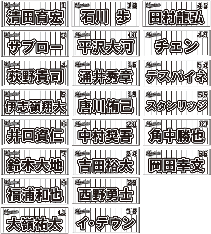 大注目ルーキーの平沢選手をはじめ、中村選手、チェン選手などホーム用で全28選手、ビジター用でも23選手がラインナップ。