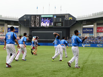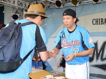 監督・コーチ、選手全員がスタンドにサインボールの投げ入れを行います。